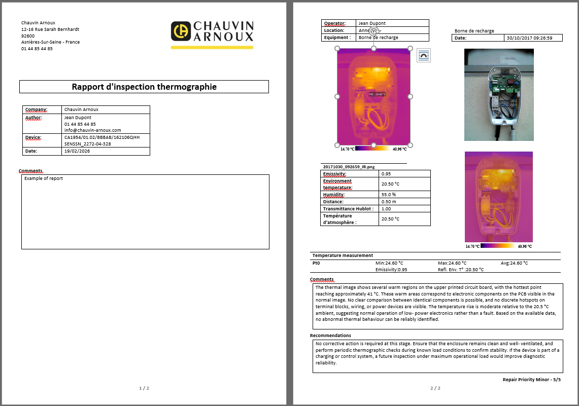 CAmReport AI is Chauvin Arnoux's thermographic analysis software incorporating specialised artificial intelligence. It assists you in interpreting thermal images and automatically generates observations and recommendations, ready to be included in your reports.